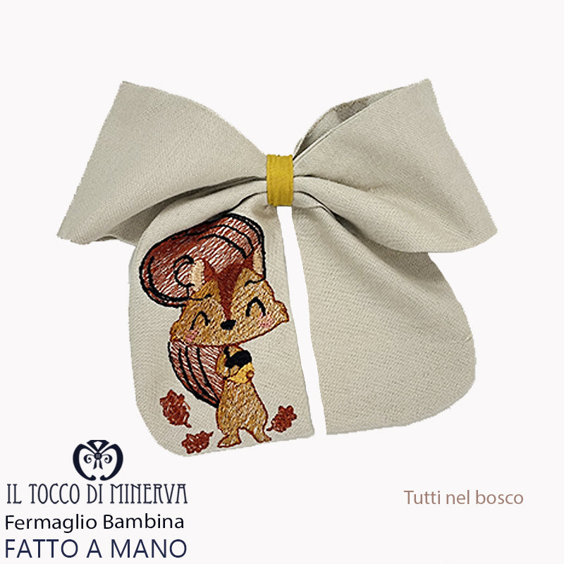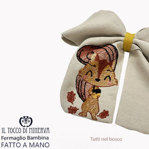 Fermaglio per capelli in lino beige, con ricamo di uno scoiattolo. Personalizzabile con il nome della bimba a cui viene regalato. elegante idea regalo da bambina.