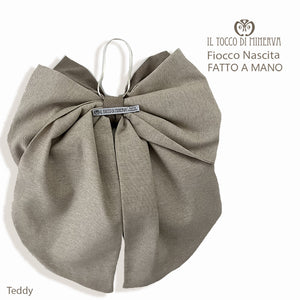 Tutto realizzato con tessuto 100% cotone. E' possibile personalizzarlo con il nome del bambino, ricamato con seta sul lato del fiocco avanti. Sui fiocchi , al centro , un dolcissimo orsetto bombato in pelliccia di pecora ,con dettaglio di fiocco in lino sul collo.